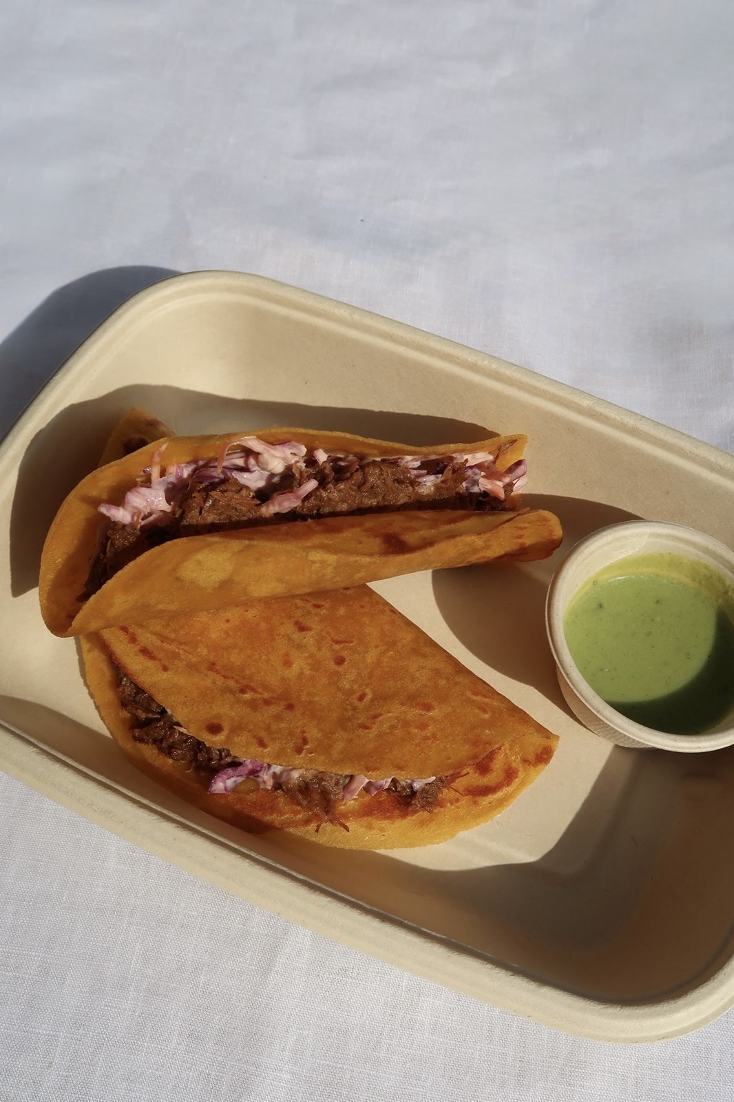 Slow-cooked grass-fed beef cooked in broth for 6 hours, on a gluten-free sweet potato tortilla, homemade coleslaw & a mango habanero hot sauce.