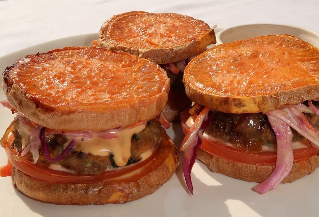 Grass-fed beef, nestled between roasted sweet potato “buns,” avocado mash, finished with house-made pickled sauce.